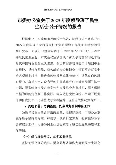【七哥公文】2026年:市委办公室关于2025年度领导班子民主生活会召开情况的报告+更多免费公文+VX:QiGeGongWen2024