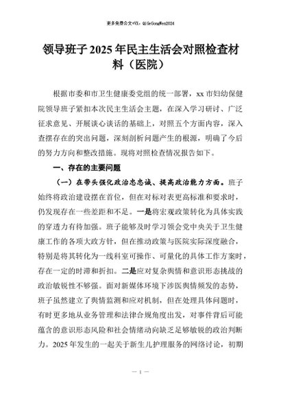 【七哥公文】2026年:领导班子2025年民主生活会对照检查材料(医院)+更多免费公文+VX:QiGeGongWen2024 - 七哥-AI智库