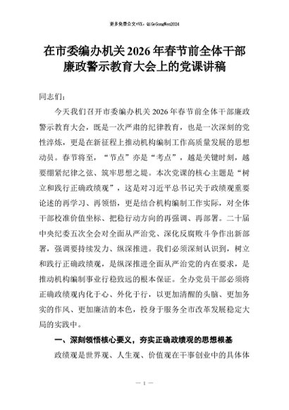 【七哥公文】2026年:在市委编办机关2026年春节前全体干部廉政警示教育大会上的党课讲稿+更多免费公文+VX:QiGeGongWen2024