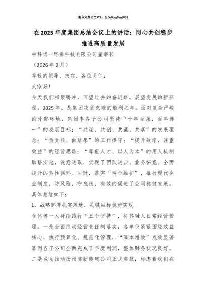 【七哥公文】2026年:在2025年度集团总结会议上的讲话:同心共创稳步推进高质量发展_副本+更多免费公文+VX:QiGeGongWen2024