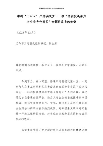 【七哥公文】2026年:奋楫‘十五五’·义非共筑梦——在“非洲发展潜力与中非合作意义”专题讲座上的致辞+更多免费公文+VX:QiGeGongWen2024