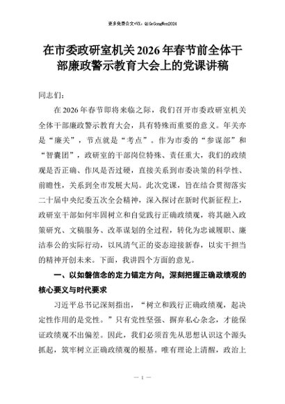 【七哥公文】2026年:在市委政研室机关2026年春节前全体干部廉政警示教育大会上的党课讲稿+更多免费公文+VX:QiGeGongWen2024