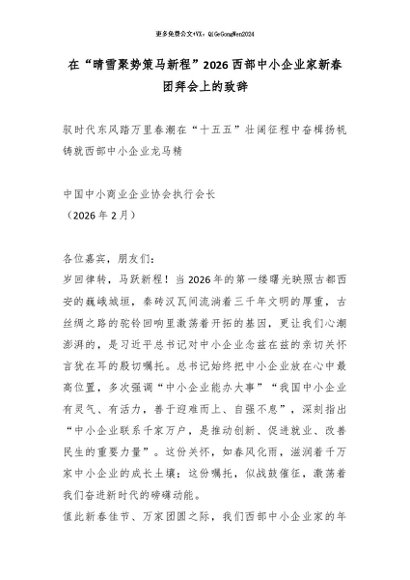 【七哥公文】2026年:在“晴雪聚势策马新程”2026西部中小企业家新春团拜会上的致辞_副本+更多免费公文+VX:QiGeGongWen2024