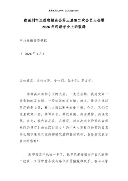 【七哥公文】2026年:在深圳市江西安福商会第三届第二次会员大会暨2026年迎新年会上的致辞+更多免费公文+VX:QiGeGongWen2024