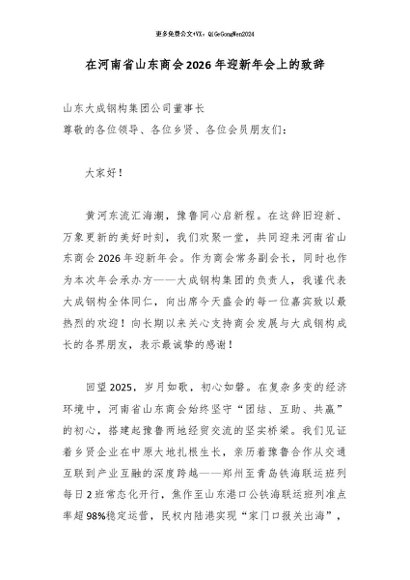 / 【七哥公文】2026年:在河南省山东商会2026年迎新年会上的致辞+更多免费公文+VX:QiGeGongWen2024