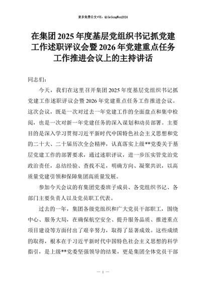 【七哥公文】2026年:在集团2025年度基层党组织书记抓党建工作述职评议会暨2026年党建重点任务工作推进会议上的主持讲话+更多免费公文+VX:QiGeGongWen2024