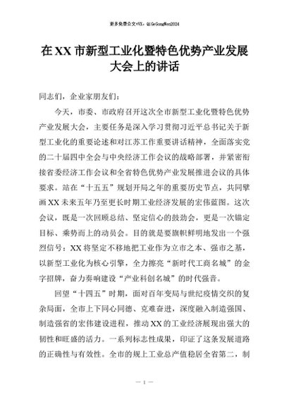 【七哥公文】2026年:在XX市新型工业化暨特色优势产业发展大会上的讲话+更多免费公文+VX:QiGeGongWen2024