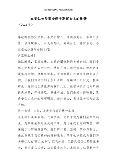 / 【七哥公文】2026年:在安仁长沙商会新年联谊会上的致辞_副本+更多免费公文+VX:QiGeGongWen2024