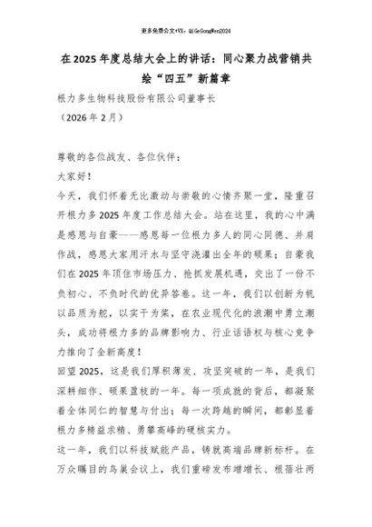 【七哥公文】2026年:在2025年度总结大会上的讲话:同心聚力战营销共绘“四五”新篇章_副本+更多免费公文+VX:QiGeGongWen2024