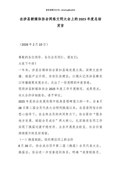 【七哥公文】2026年:在涉县新媒体协会网络文明大会上的2025年度总结发言_副本+更多免费公文+VX:QiGeGongWen2024