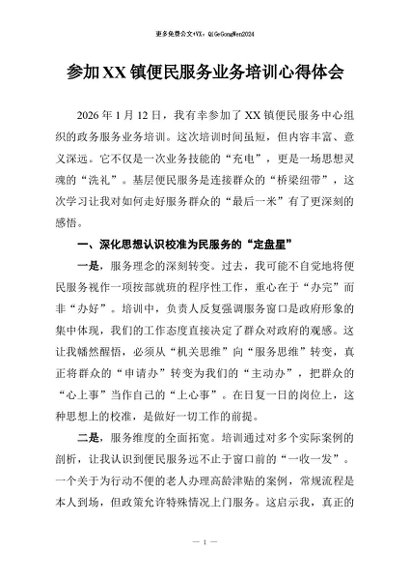 / 【七哥公文】2026年:参加XX镇便民服务业务培训心得体会+更多免费公文+VX:QiGeGongWen2024