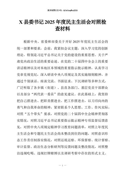 / 【七哥公文】2026年:X县委书记2025年度民主生活会对照检查材料+更多免费公文+VX:QiGeGongWen2024