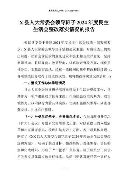【七哥公文】2026年:X县人大常委会领导班子2024年度民主生活会整改落实情况的报告+更多免费公文+VX:QiGeGongWen2024