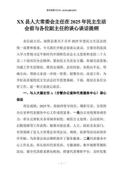 【七哥公文】2026年:XX县人大常委会主任在2025年民主生活会前与各位副主任的谈心谈话提纲+更多免费公文+VX:QiGeGongWen2024
