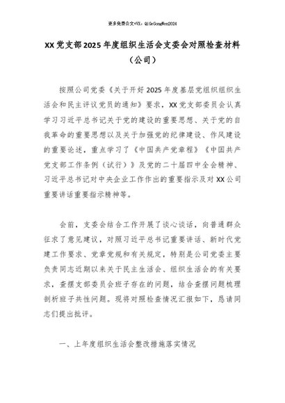 【七哥公文】2026年:XX党支部2025年度组织生活会支委会对照检查材料(公司)+更多免费公文+VX:QiGeGongWen2024