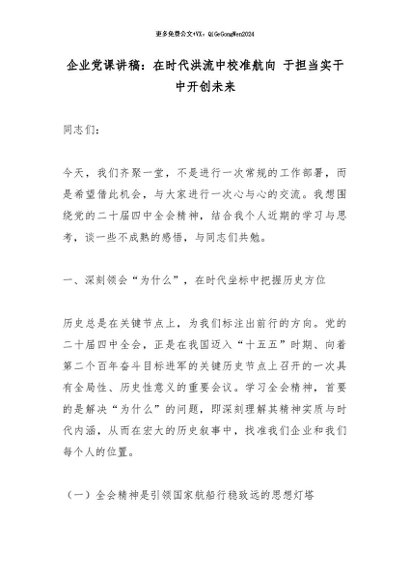 【七哥公文】2026年:企业党课讲稿:在时代洪流中校准航向 于担当实干中开创未来+更多免费公文+VX:QiGeGongWen2024