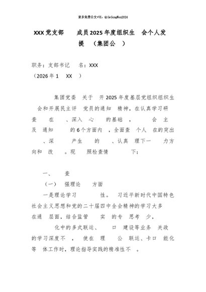 【七哥公文】2026年:XXX党支部班子成员2025年度组织生活会个人发言提纲(集团公司)+更多免费公文+VX:QiGeGongWen2024