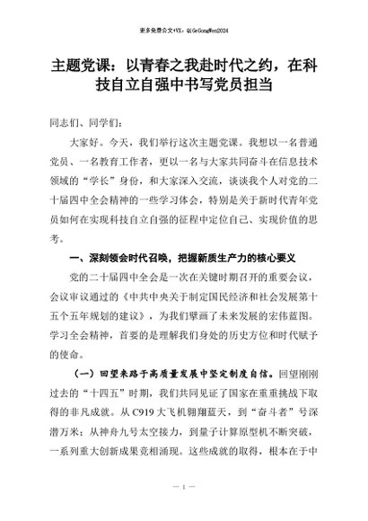 【七哥公文】2026年:主题党课:以青春之我赴时代之约,在科技自立自强中书写党员担当+更多免费公文+VX:QiGeGongWen2024