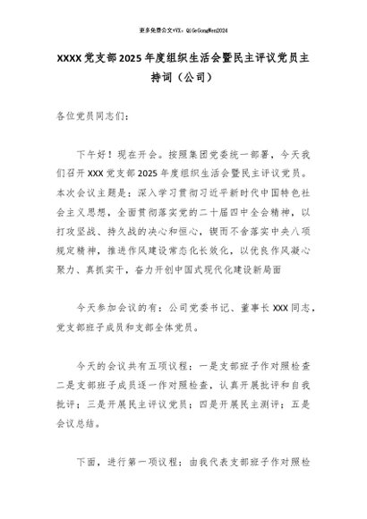 【七哥公文】2026年:XXXX党支部2025年度组织生活会暨民主评议党员主持词(公司)+更多免费公文+VX:QiGeGongWen2024
