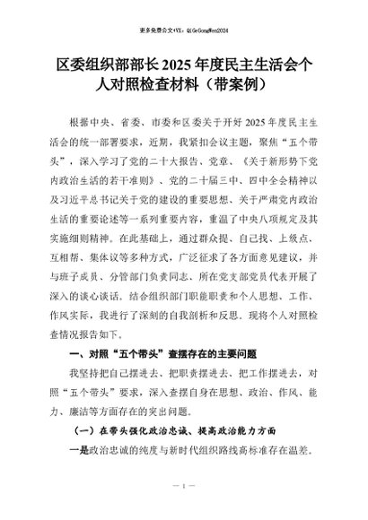 【七哥公文】2026年:区委组织部部长2025年度民主生活会个人对照检查材料(带案例)+更多免费公文+VX:QiGeGongWen2024