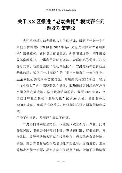 【七哥公文】2026年:关于XX区推进“老幼共托”模式存在问题及对策建议+更多免费公文+VX:QiGeGongWen2024