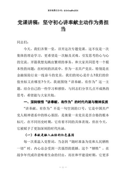 / 【七哥公文】2026年:党课讲稿:坚守初心讲奉献主动作为勇担当+更多免费公文+VX:QiGeGongWen2024
