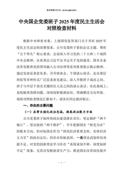 【七哥公文】2026年:中央国企党委班子2025年度民主生活会对照检查材料+更多免费公文+VX:QiGeGongWen2024