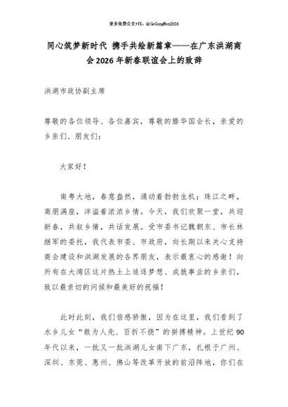 【七哥公文】2026年:同心筑梦新时代 携手共绘新篇章——在广东洪湖商会2026年新春联谊会上的致辞+更多免费公文+VX:QiGeGongWen2024