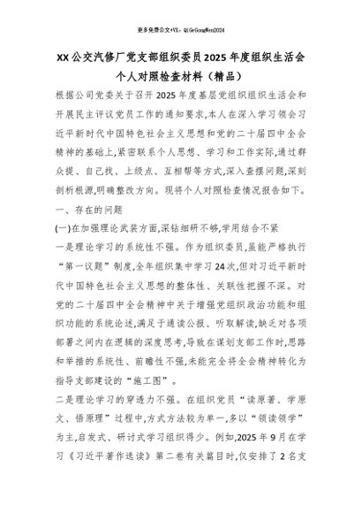 【七哥公文】2026年:XX公交汽修厂党支部组织委员2025年度组织生活会个人对照检查材料(精品)+更多免费公文+VX:QiGeGongWen2024