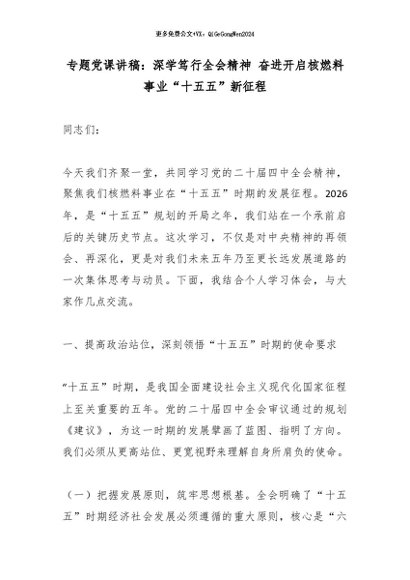 【七哥公文】2026年:专题党课讲稿:深学笃行全会精神 奋进开启核燃料事业“十五五”新征程_副本+更多免费公文+VX:QiGeGongWen2024