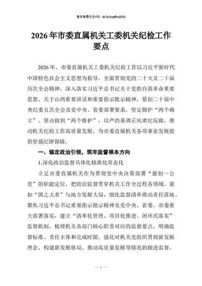 / 【七哥公文】2026年:2026年市委直属机关工委机关纪检工作要点+更多免费公文+VX:QiGeGongWen2024