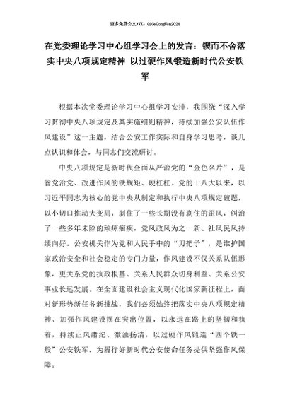 【七哥公文】2026年:在党委理论学习中心组学习会上的发言:锲而不舍落实中央八项规定精神 以过硬作风锻造新时代公安铁军+更多免费公文+VX:QiGeGongWen2024