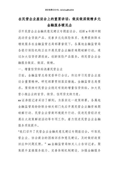 【七哥公文】2026年:在民营企业座谈会上的重要讲话:做实做深做精多元金融服务暖民企+更多免费公文+VX:QiGeGongWen2024