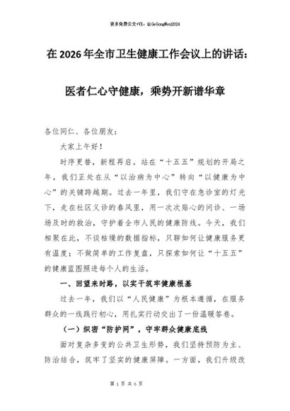 【七哥公文】2026年:在2026年全市卫生健康工作会议上的讲话:医者仁心守健康,乘势开新谱华章+更多免费公文+VX:QiGeGongWen2024