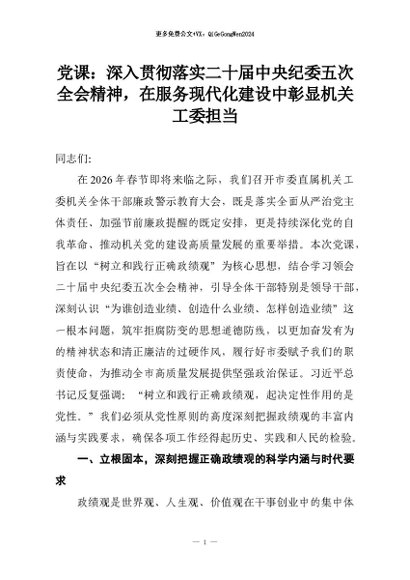 【七哥公文】2026年:党课:深入贯彻落实二十届中央纪委五次全会精神,在服务现代化建设中彰显机关工委担当+更多免费公文+VX:QiGeGongWen2024