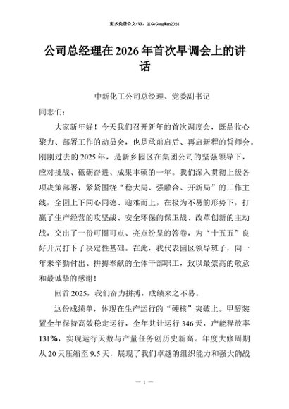 / 【七哥公文】2026年:公司总经理在2026年首次早调会上的讲话+更多免费公文+VX:QiGeGongWen2024