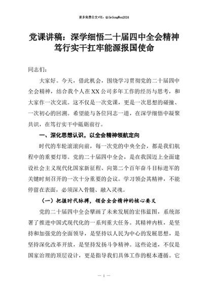 【七哥公文】2026年:党课讲稿:深学细悟二十届四中全会精神笃行实干扛牢能源报国使命+更多免费公文+VX:QiGeGongWen2024