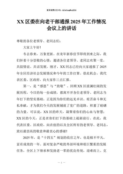【七哥公文】2026年:XX区委在向老干部通报2025年工作情况会议上的讲话+更多免费公文+VX:QiGeGongWen2024