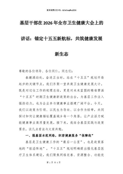 【七哥公文】2026年:基层干部在2026年全市卫生健康大会上的讲话:锚定十五五新航标,共筑健康发展新生态_副本+更多免费公文+VX:QiGeGongWen2024