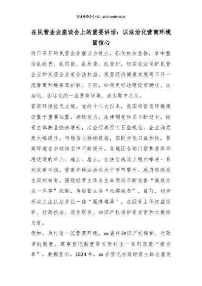 【七哥公文】2026年:在民营企业座谈会上的重要讲话:以法治化营商环境固信心+更多免费公文+VX:QiGeGongWen2024