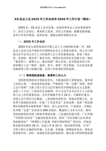 【七哥公文】2026年:XX县总工会2025年工作总结和2026年工作计划(精品)+更多免费公文+VX:QiGeGongWen2024
