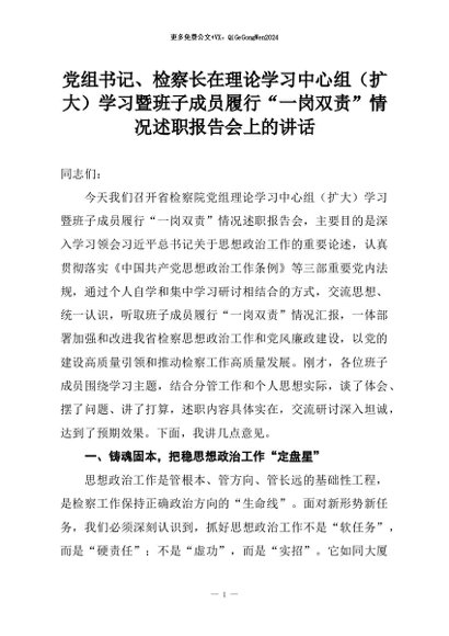 【七哥公文】2026年:党组书记、检察长在理论学习中心组(扩大)学习暨班子成员履行“一岗双责”情况述职报告会上的讲话+更多免费公文+VX:QiGeGongWen2024