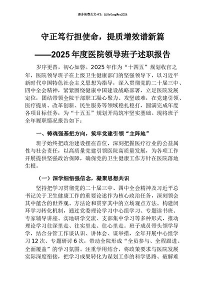 【七哥公文】2026年:2025年度医院领导班子述职报告:守正笃行担使命,提质增效谱新篇+更多免费公文+VX:QiGeGongWen2024