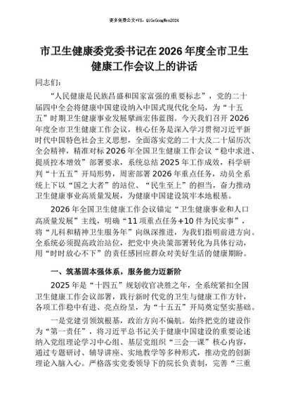 【七哥公文】2026年:市卫生健康委党委书记在2026年度全市卫生健康工作会议上的讲话+更多免费公文+VX:QiGeGongWen2024