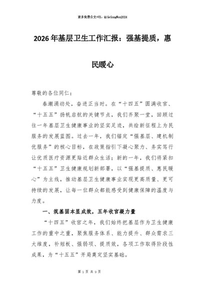 【七哥公文】2026年:2026年基层卫生工作汇报:强基提质,惠民暖心_副本+更多免费公文+VX:QiGeGongWen2024