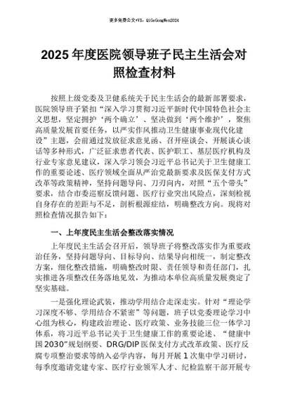 【七哥公文】2026年:2025年度医院领导班子民主生活会对照检查材料+更多免费公文+VX:QiGeGongWen2024
