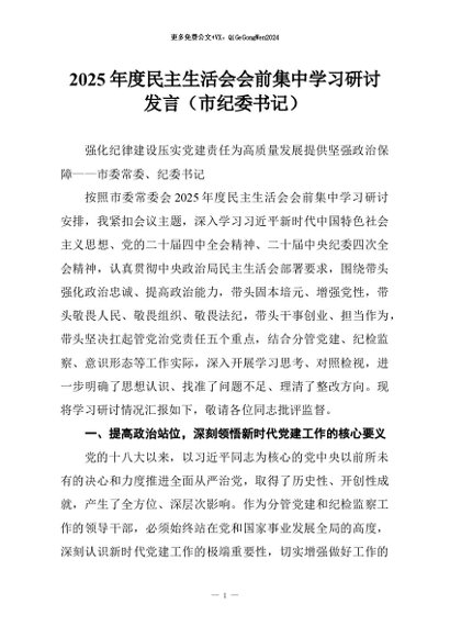【七哥公文】2026年:2025年度民主生活会会前集中学习研讨发言(市纪委书记)+更多免费公文+VX:QiGeGongWen2024 - 七哥-AI智库