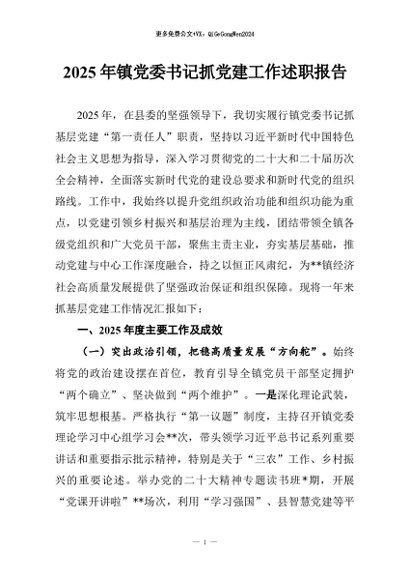 / 【七哥公文】2026年:2025年镇党委书记抓党建工作述职报告+更多免费公文+VX:QiGeGongWen2024
