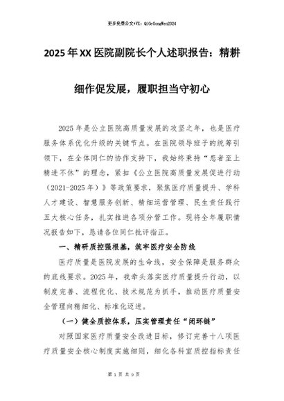 【七哥公文】2026年:2025年XX医院副院长个人述职报告:精耕细作促发展,履职担当守初心_副本+更多免费公文+VX:QiGeGongWen2024