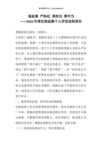 【七哥公文】2026年:强监督 严执纪 勇担当 善作为——2025年度纪检监察个人评优述职报告+更多免费公文+VX:QiGeGongWen2024